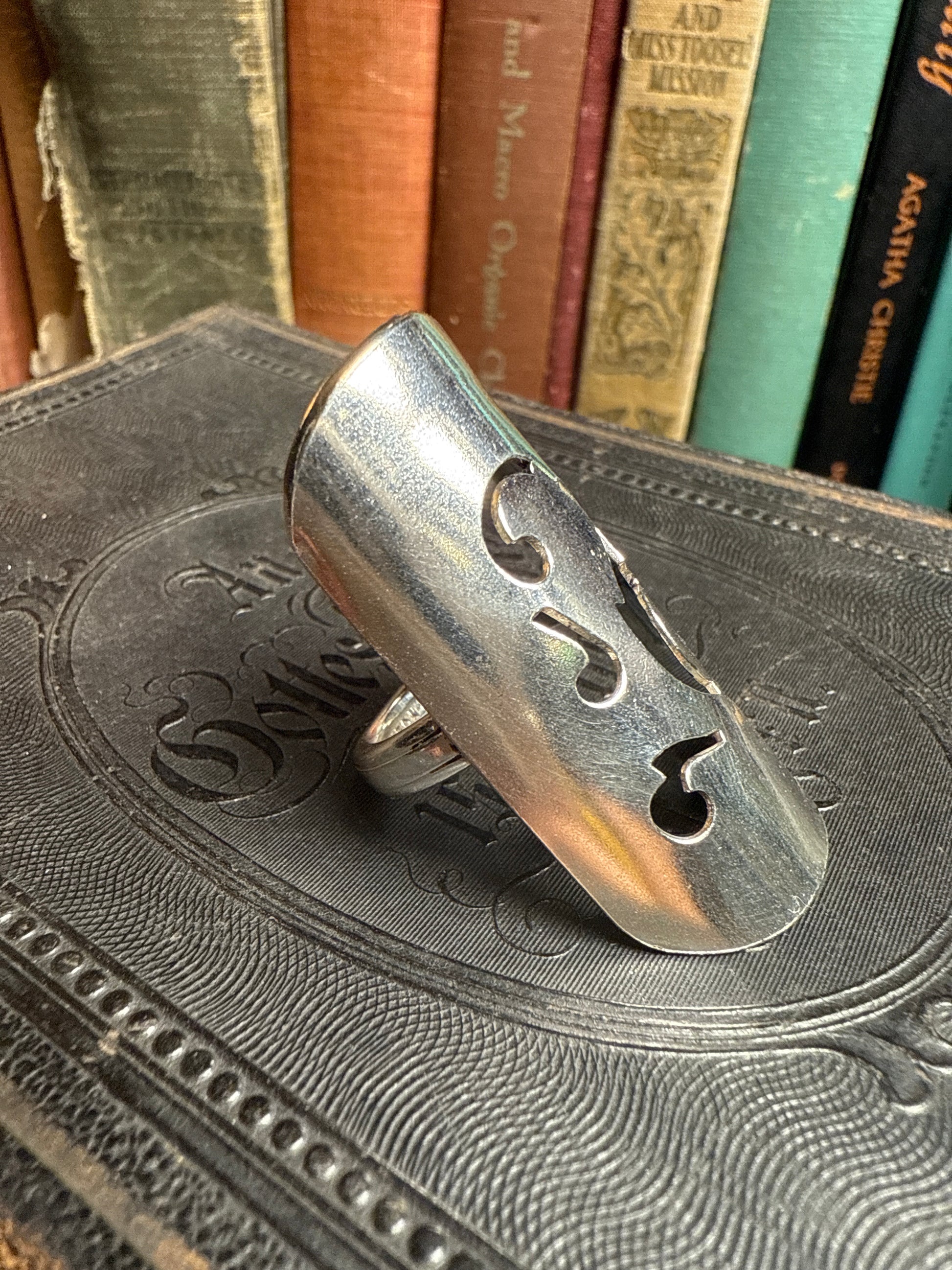 Silver plated ring made from slotted spoon bowl and spoon handle.