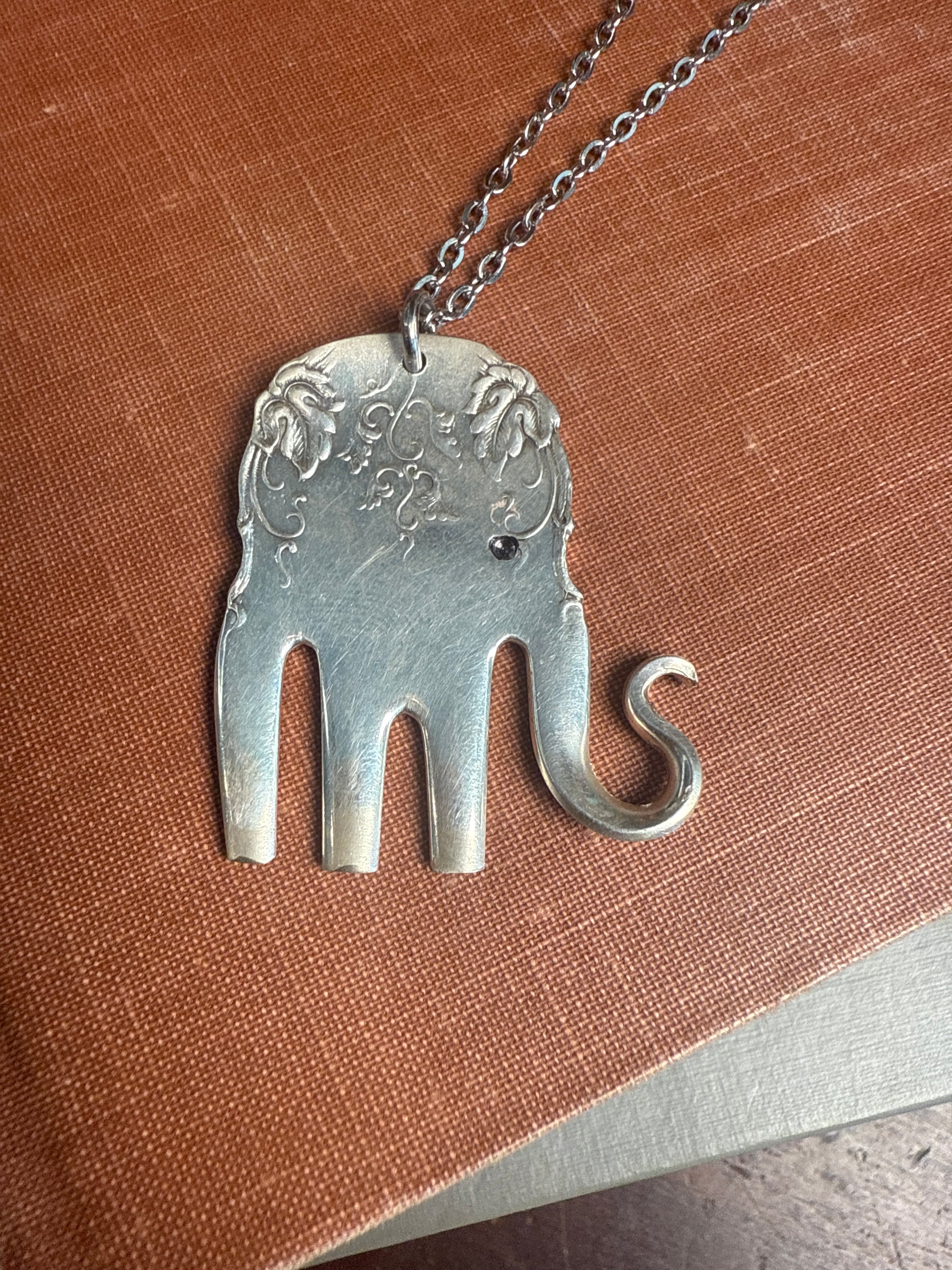 Silver plate, elephant, fork necklace on 20 inch stainless steel chain.