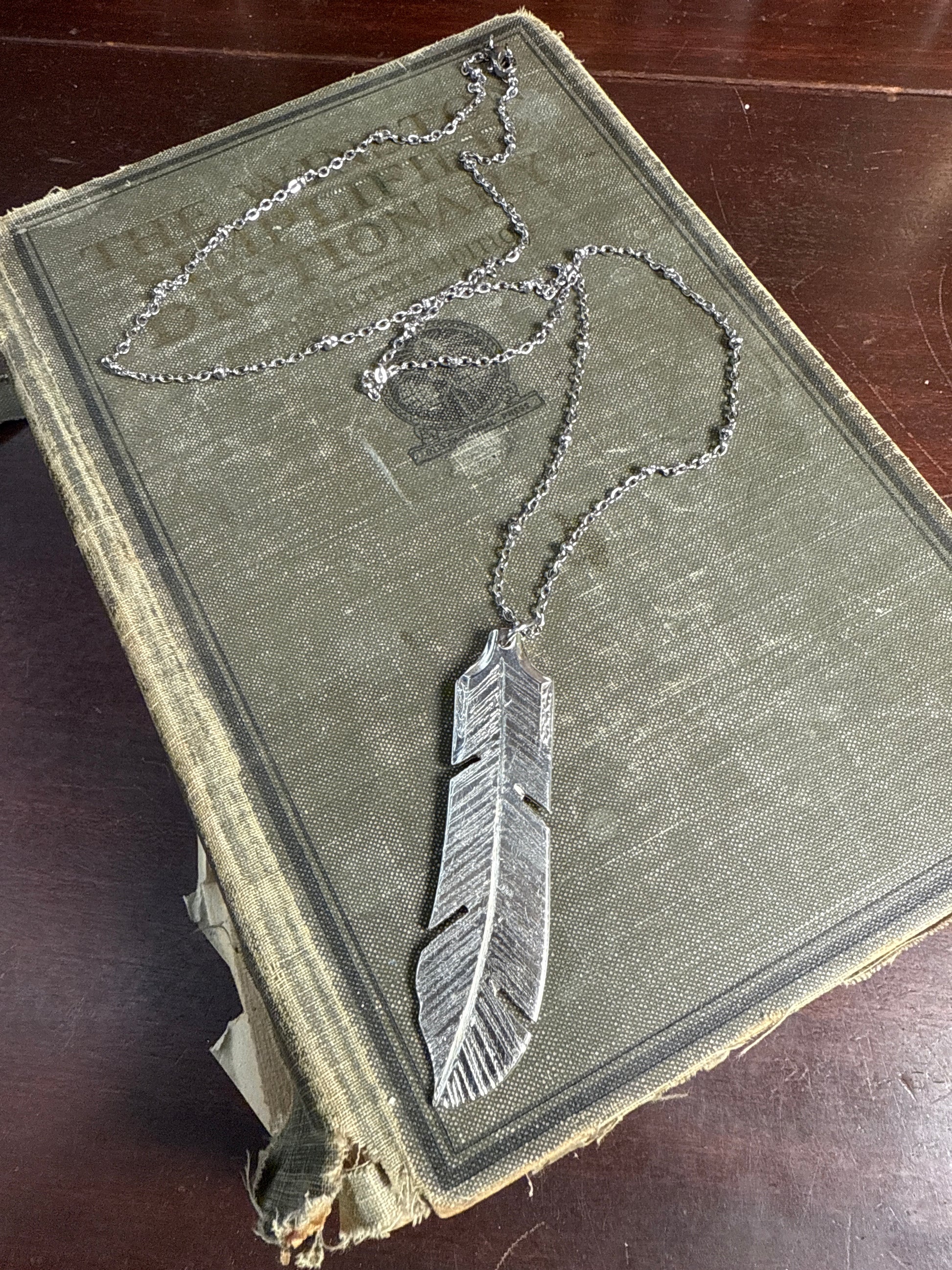 Silver plate, feather design necklace made from vintage butter knife on satellite 26 inch chain.
