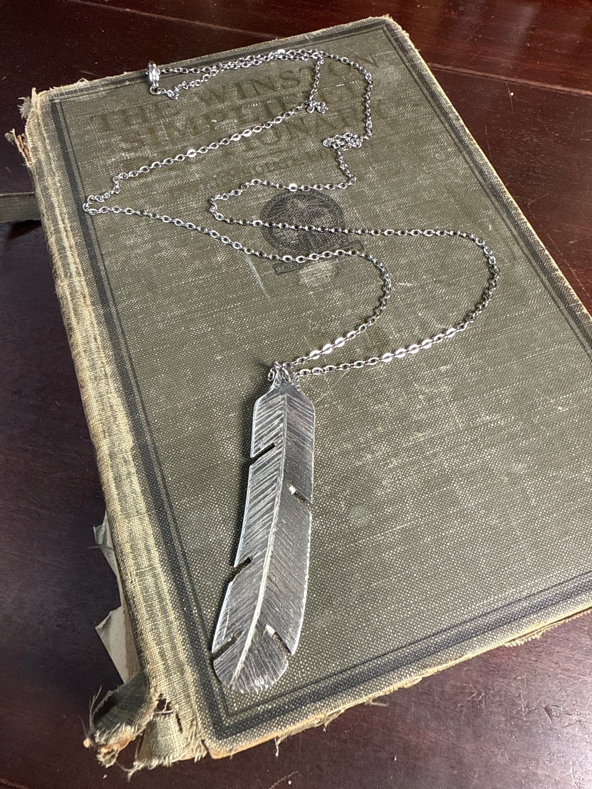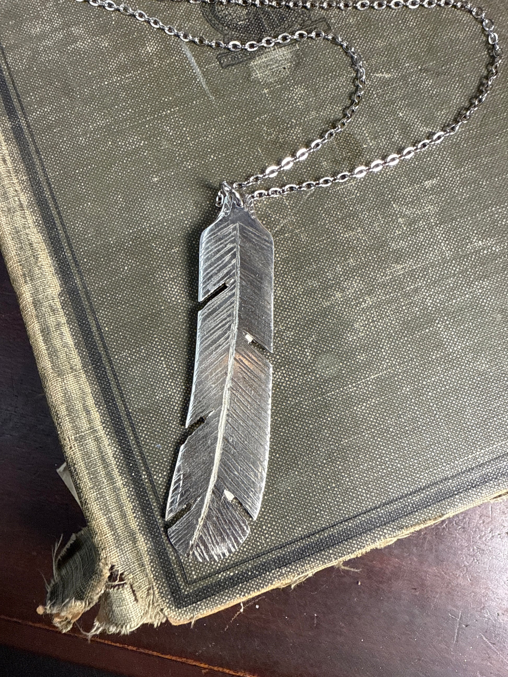 Silver plate, feather design necklace made from vintage butter knife on 30 inch chain.