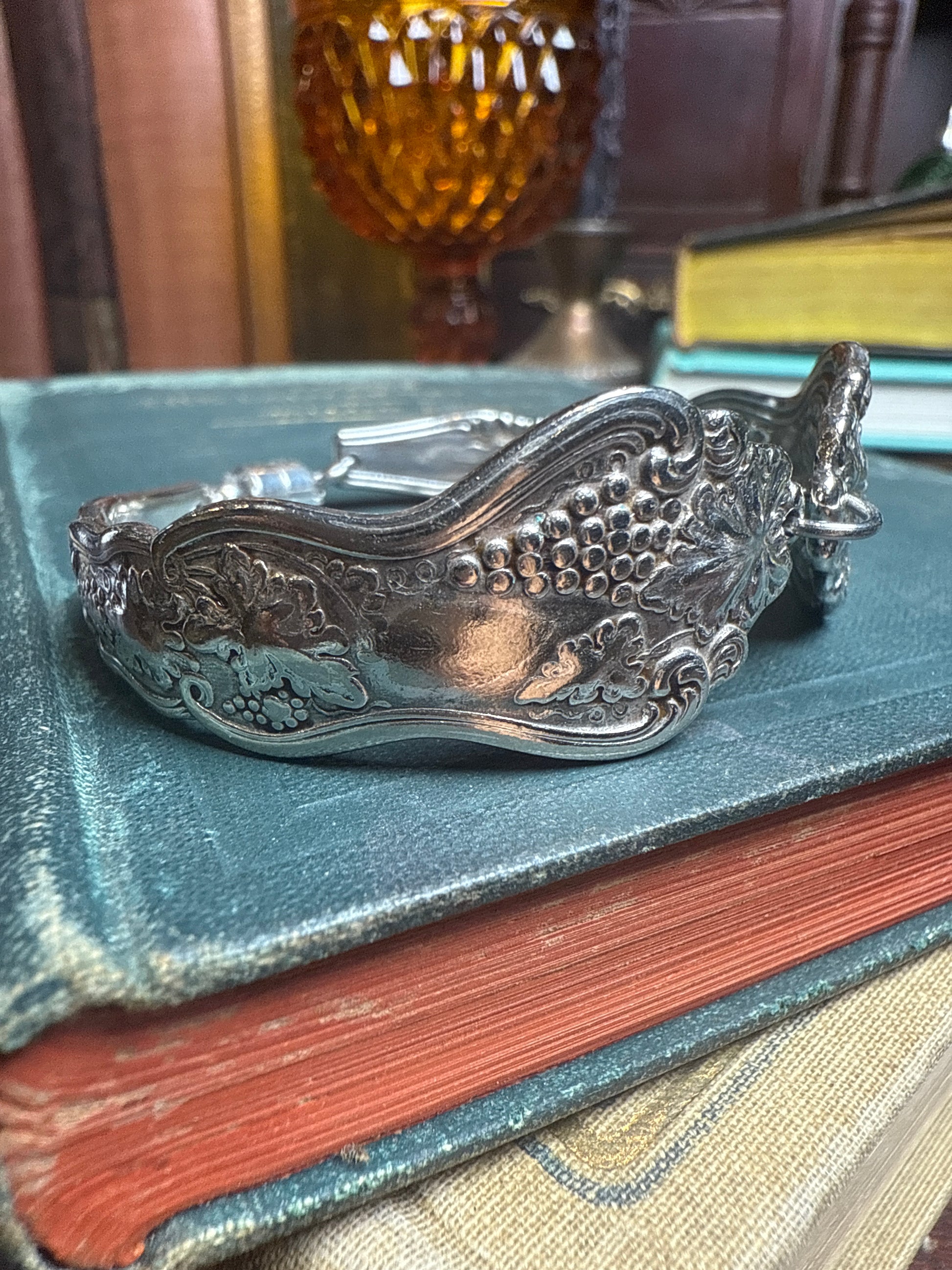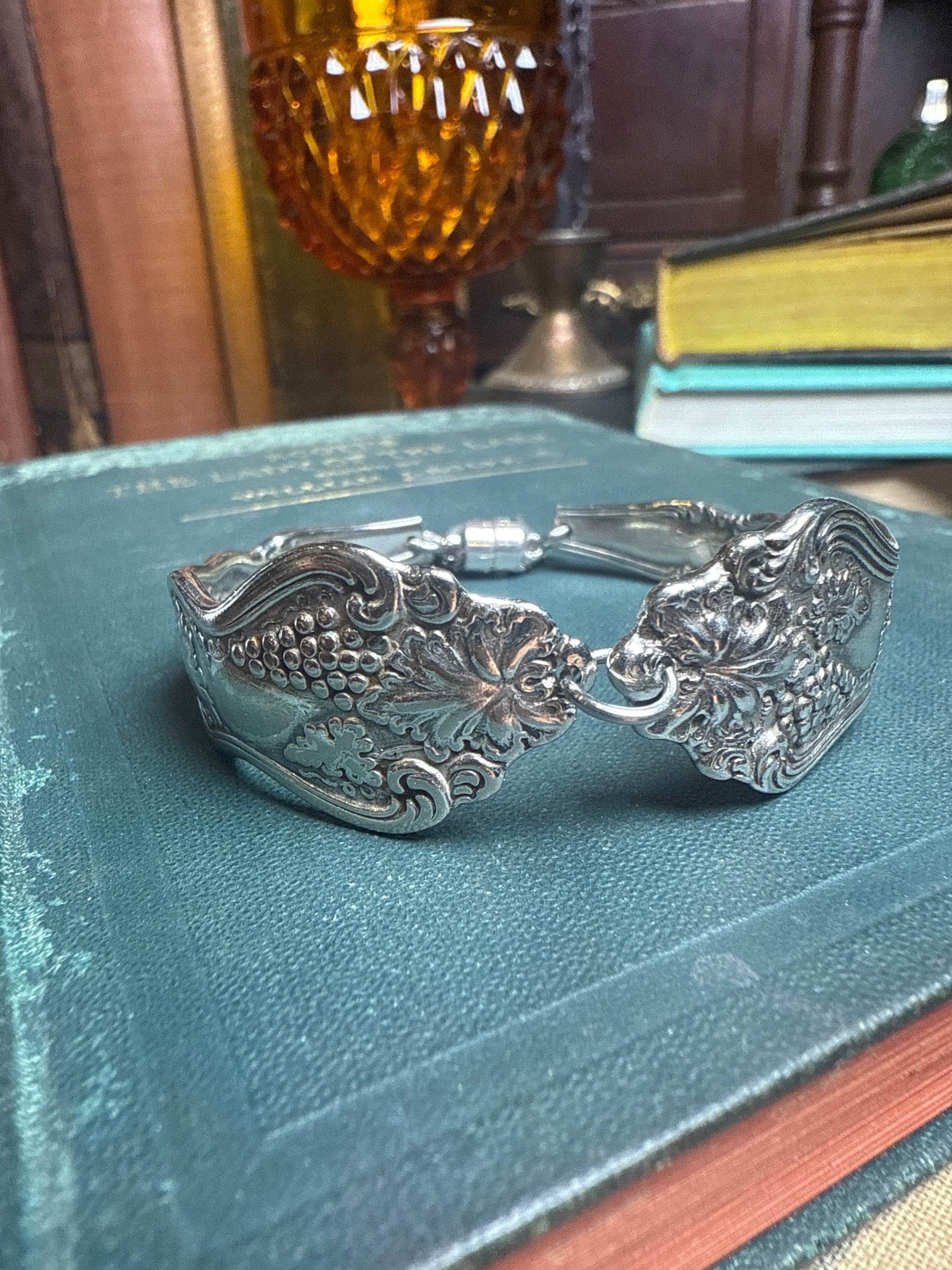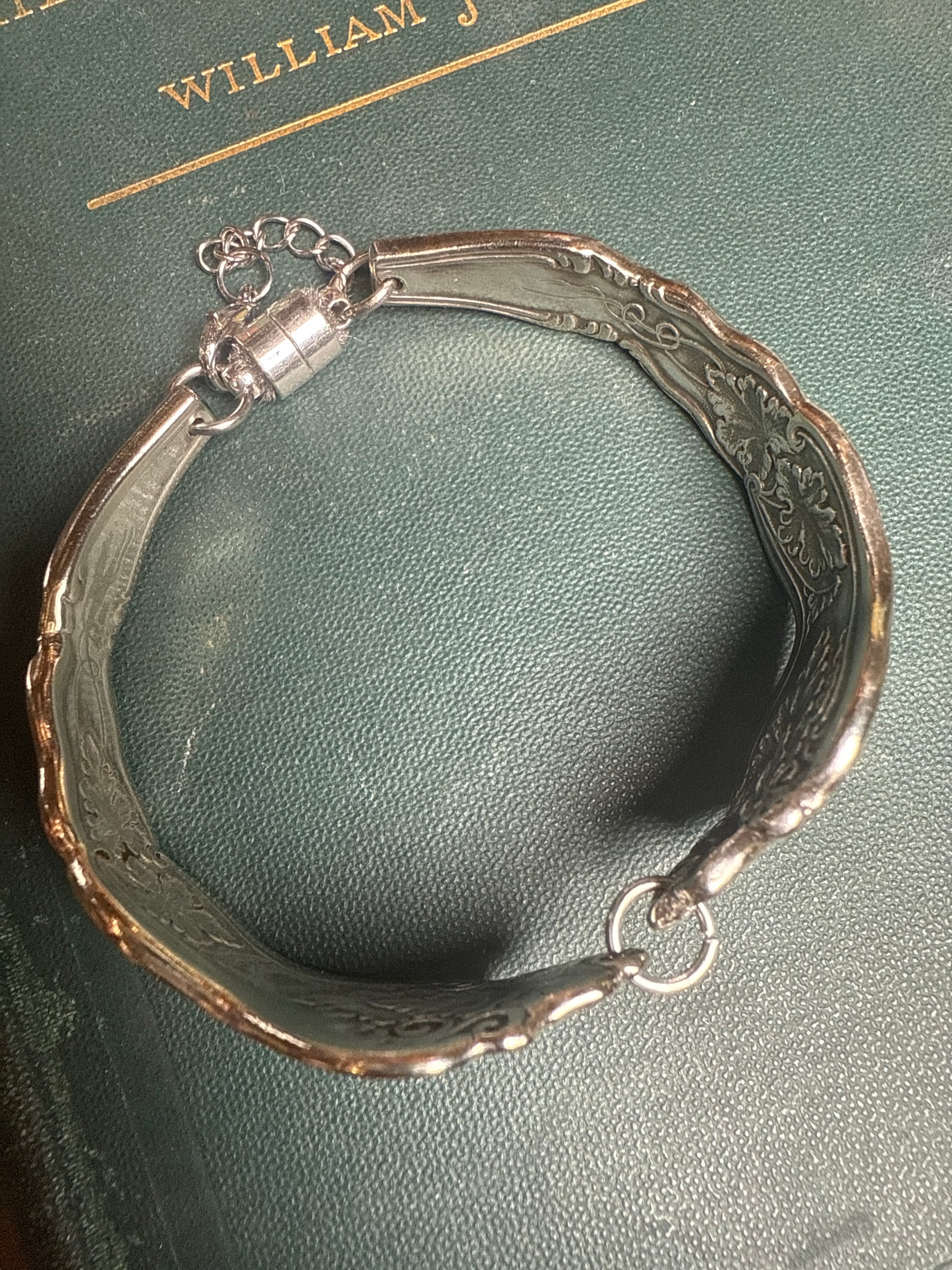 Silver plate bracelet and the pattern Moselle from 1906. The bracelet fits wrist up to 6 1/4 inches and features a magnetic clasp with a safety chain.