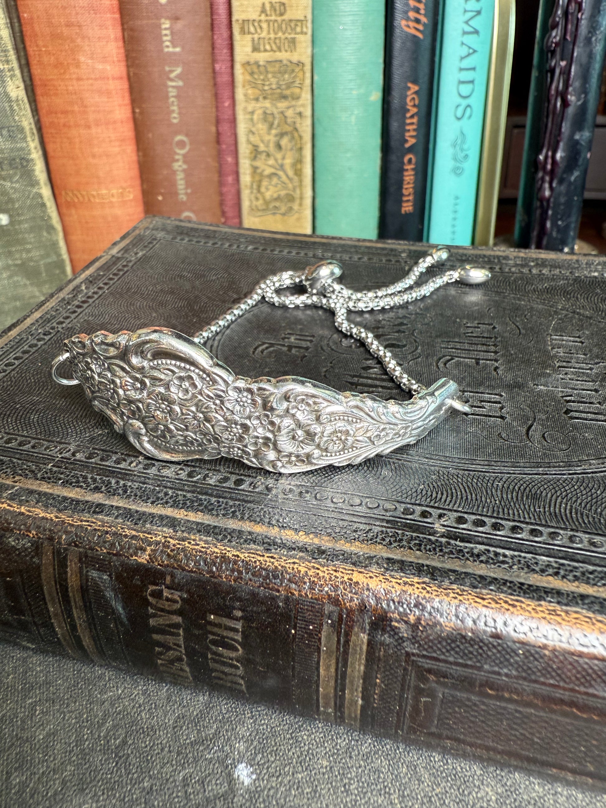 Bracelet made from a vintage spoon from 1971 in the pattern Silver Renaissance. Has a slider “clasp” that fits most wrists.