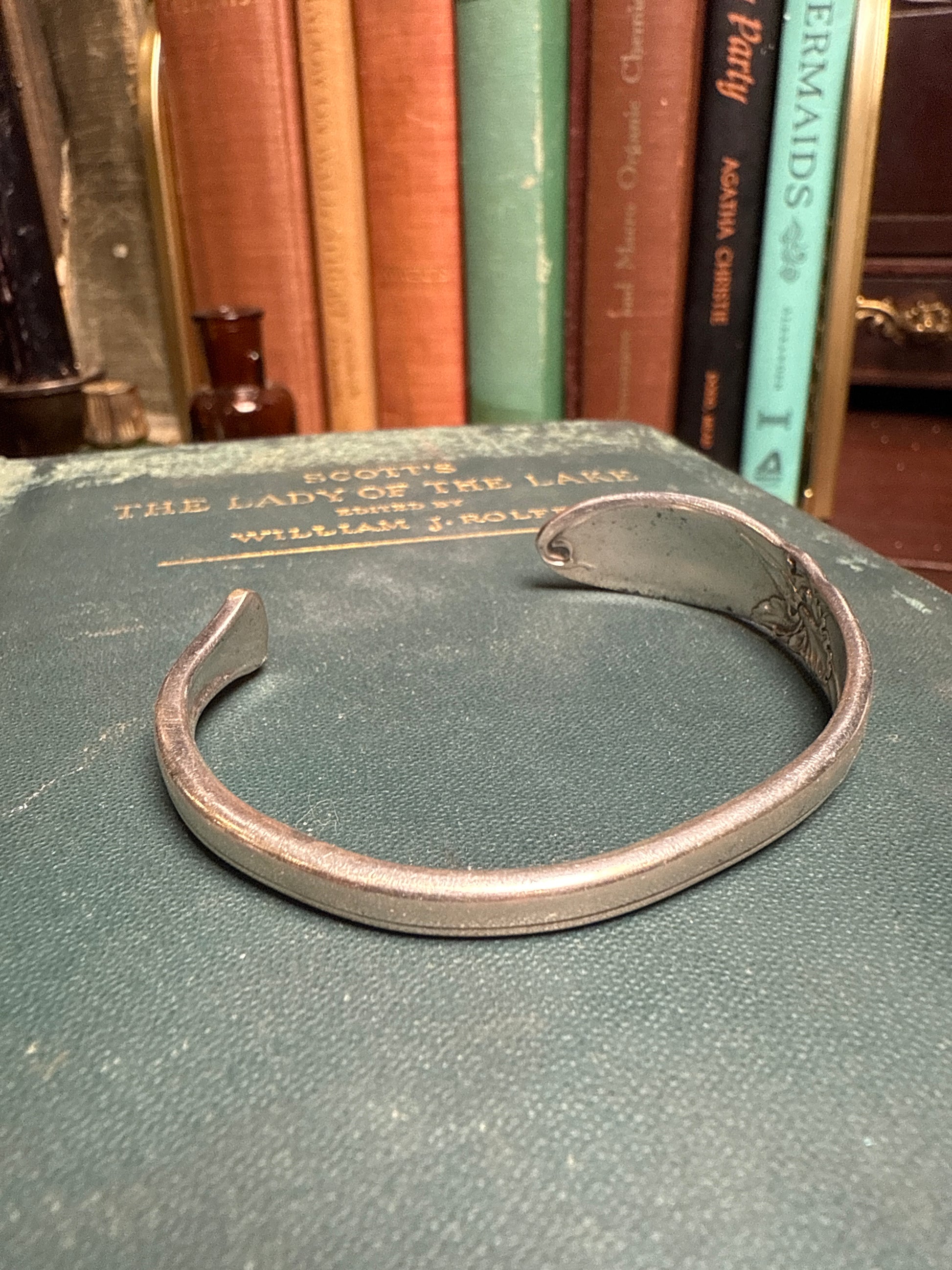 This is a silver plate, cuff bracelet, in the pattern White Orchid from 1953. Fits wrist up to 6.5”